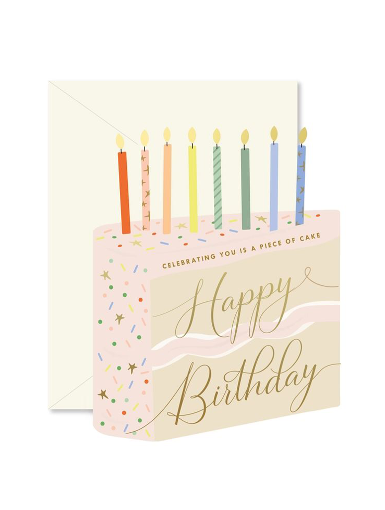 - Celebrating you is a piece of cake! A fun and colorful die-cut folded greeting card and coordinating envelope to wish a very Happy Birthday!